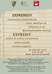 A magyar nyelvű, felnőtteknek szóló Expresszív gyakorlati és interaktív írásterápiás műhely önismereti és személyiségfejlesztési módszereket ötvöz kreatív írástechnikákkal, terápiás céllal. A havi rendszerességű foglalkozásokat dr. Mikola Emese írásterapeuta vezeti. A március 26-i találkozásra 18.30 -tól kerül sor a Multikulturális részlegen, a nyugati szárny 3. emeletén. A részvétel könyvtári olvasójeggyel ingyenes, regisztrálni a salamulticulturala@bjc.ro e-mail-címen, illetve …
