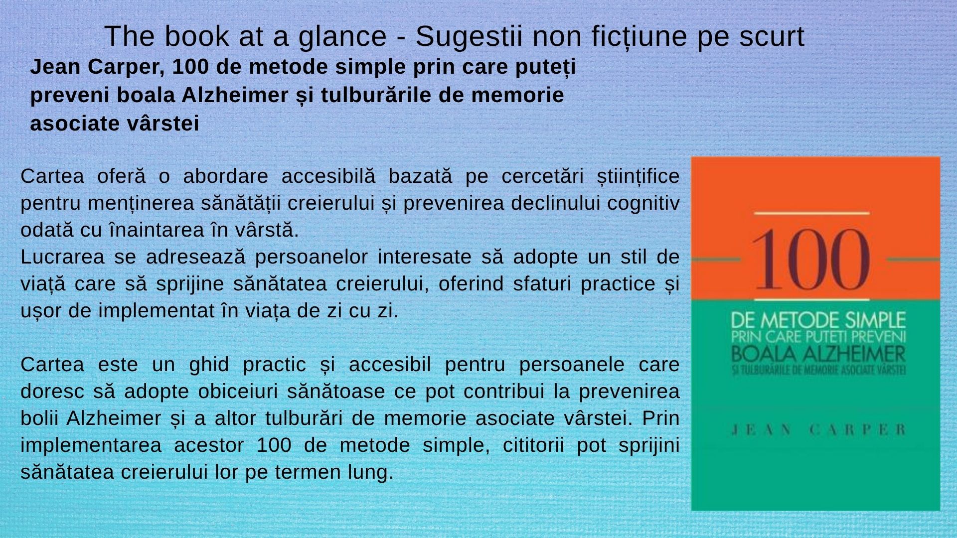 Recomandare de lectură (non-ficțiune): Jean Carper, 100 de metode simple prin care puteți preveni boala Alzheimer și tulburările de memorie asociate vârstei