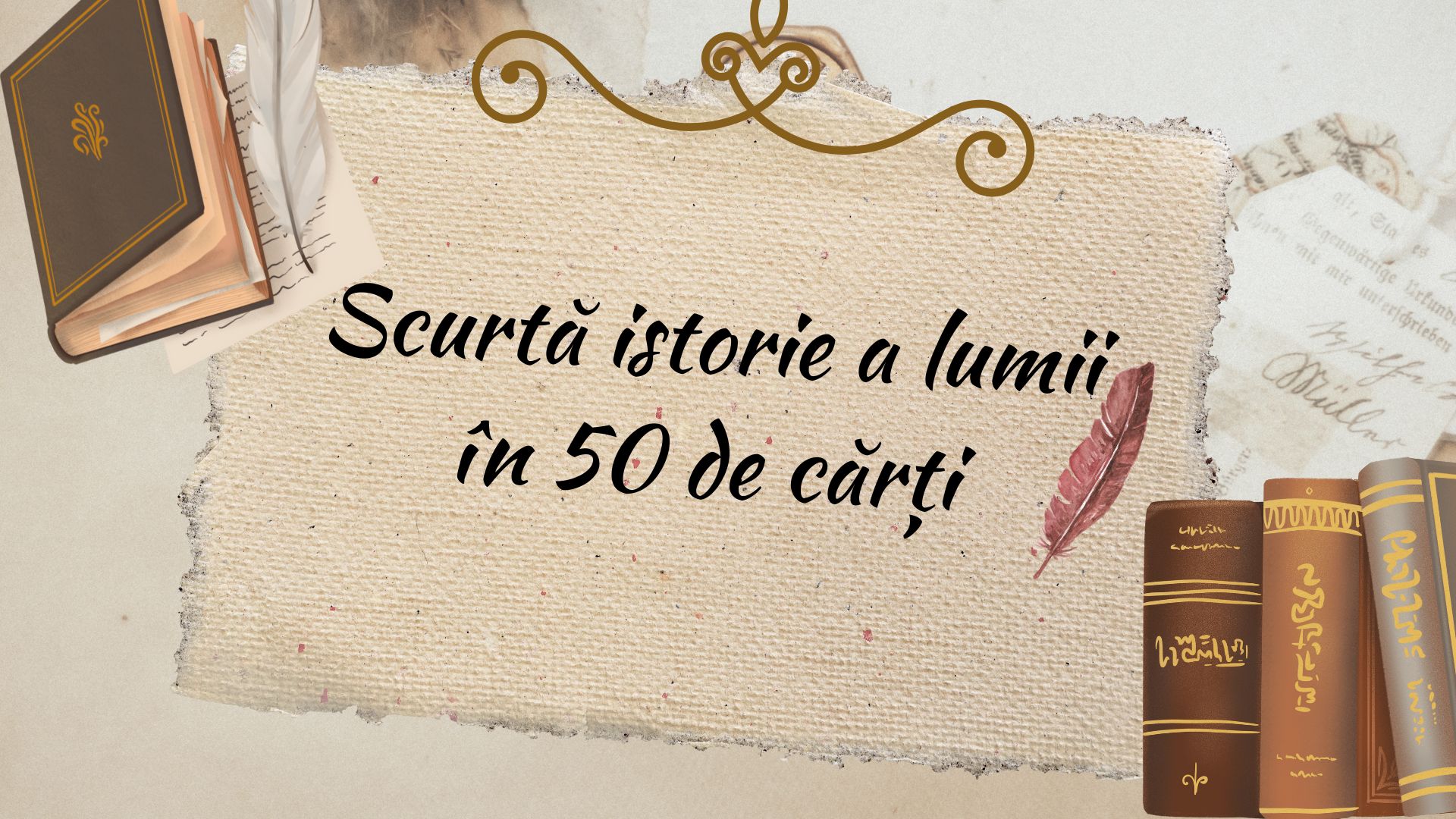 Scurtă istorie a lumii în 50 de cărți – o călătorie condensată prin epoci, idei și destine care au modelat omenirea, repovestite în fragmente esențiale. Fiecare carte este o oprire într-o istorie scrisă nu doar cu evenimente, ci cu idei care au lăsat urme.