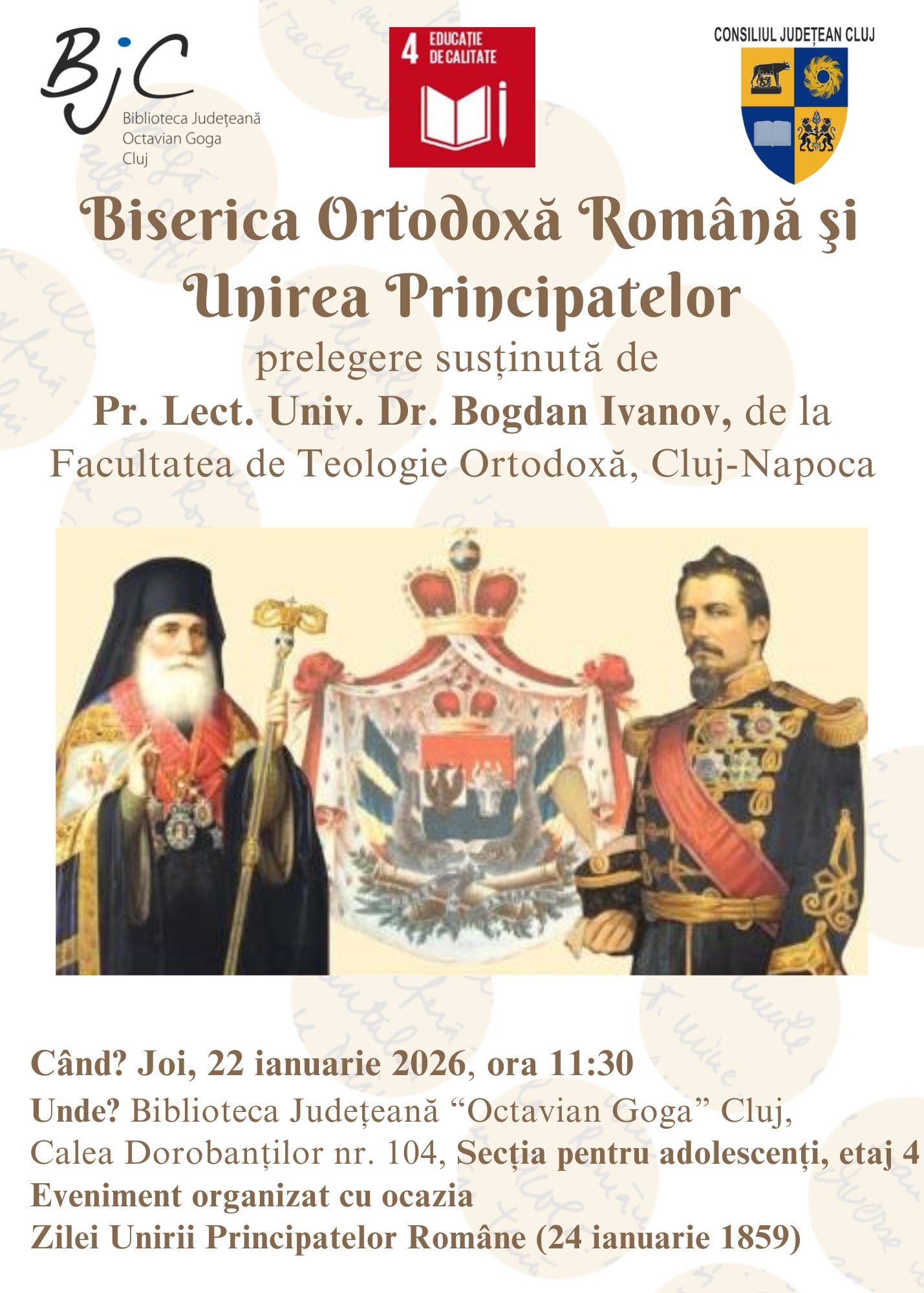 Cu ocazia împlinirii a 167 de ani de la Unirea Principatelor Române, Moldova și Țara Românească, sub conducerea lui Alexandru Ioan Cuza, la 24 ianuarie 1859, Biblioteca Județeană „Octavian Goga” Cluj vă invită la prelegerea cu titlul „Biserica Ortodoxă Română și Unirea Principatelor”, susținută de Pr. Lector Univ. Dr. Bogdan Ivanov, de la Facultatea de Teologie Ortodoxă, Cluj-Napoca.