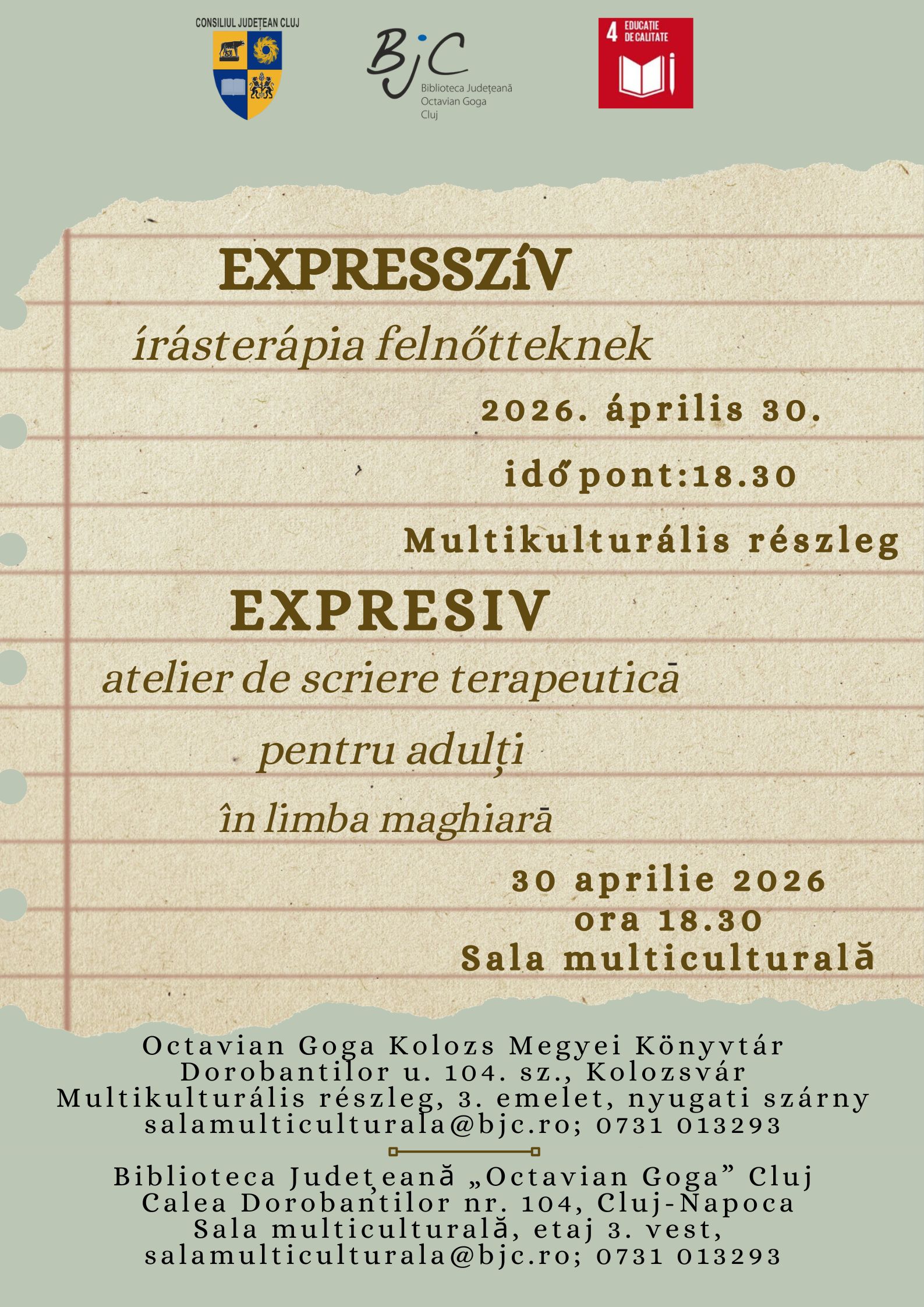 Atelierul de scriere terapeutică în limba maghiară „Expresiv” este un atelier practic și interactiv destinat adulților, care îmbină tehnici de dezvoltare personală cu scrierea creativă în scop terapeutic. Întâlnirile cu frecvență lunară se desfășoară sub coordonarea doamnei dr. Mikola Emese, specialist în scriere terapeutică.