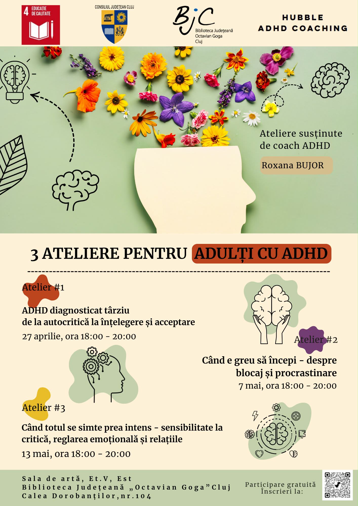 Începând cu luna aprilie vă invităm să luați parte la o serie de trei ateliere dedicate adulților cu ADHD, susținute de Roxana Bujor, coach ADHD.