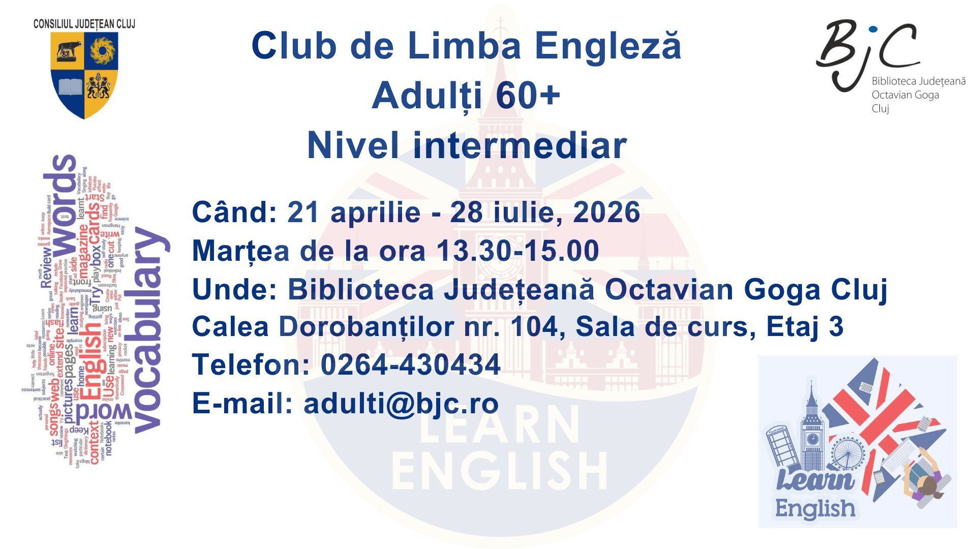 Secția împrumut pentru adulți din cadrul Bibliotecii Județene „Octavian Goga” Cluj organizează un club de învățare a limbii engleze pentru adulți 60+, nivel intermediar. Clubul este organizat la sediul central al bibliotecii, Calea Dorobanților nr. 104, sala de curs, etaj 3.