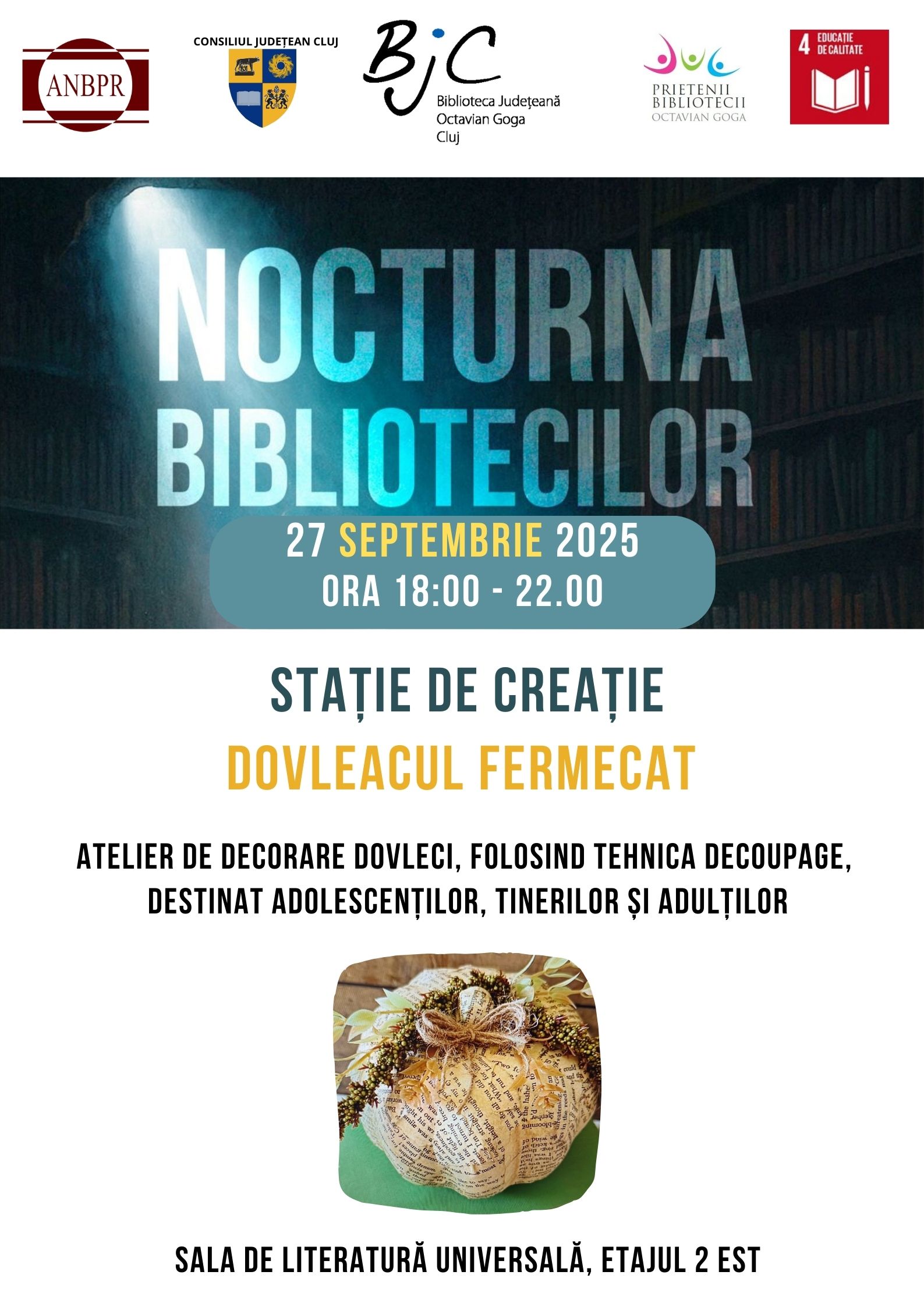 Tinerii și adulții care își doresc să petreacă seara în bibliotecă decorând un dovleac, folosind tehnica decoupage, sunt invitați să se oprească la stația de creație amenajată la etajul 2 …